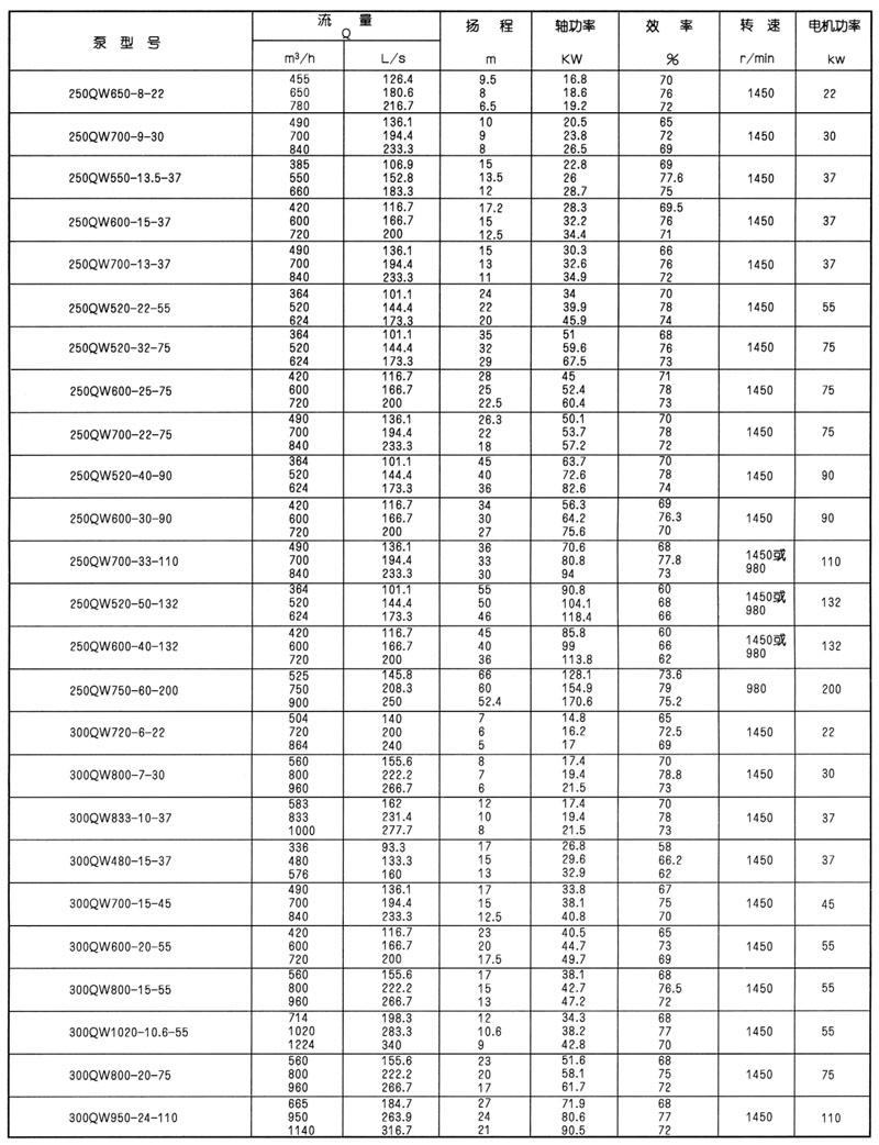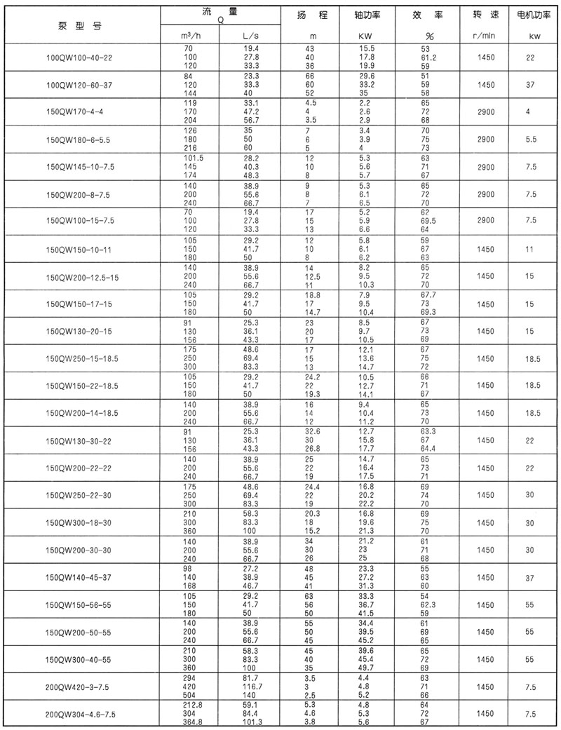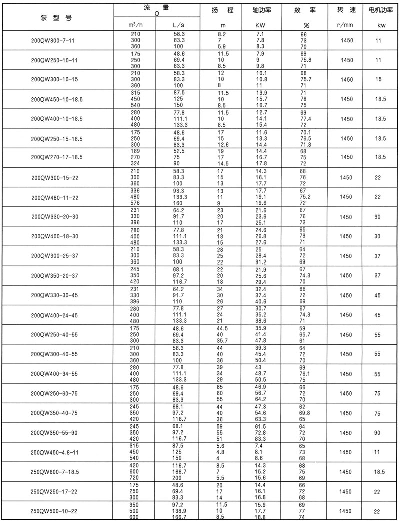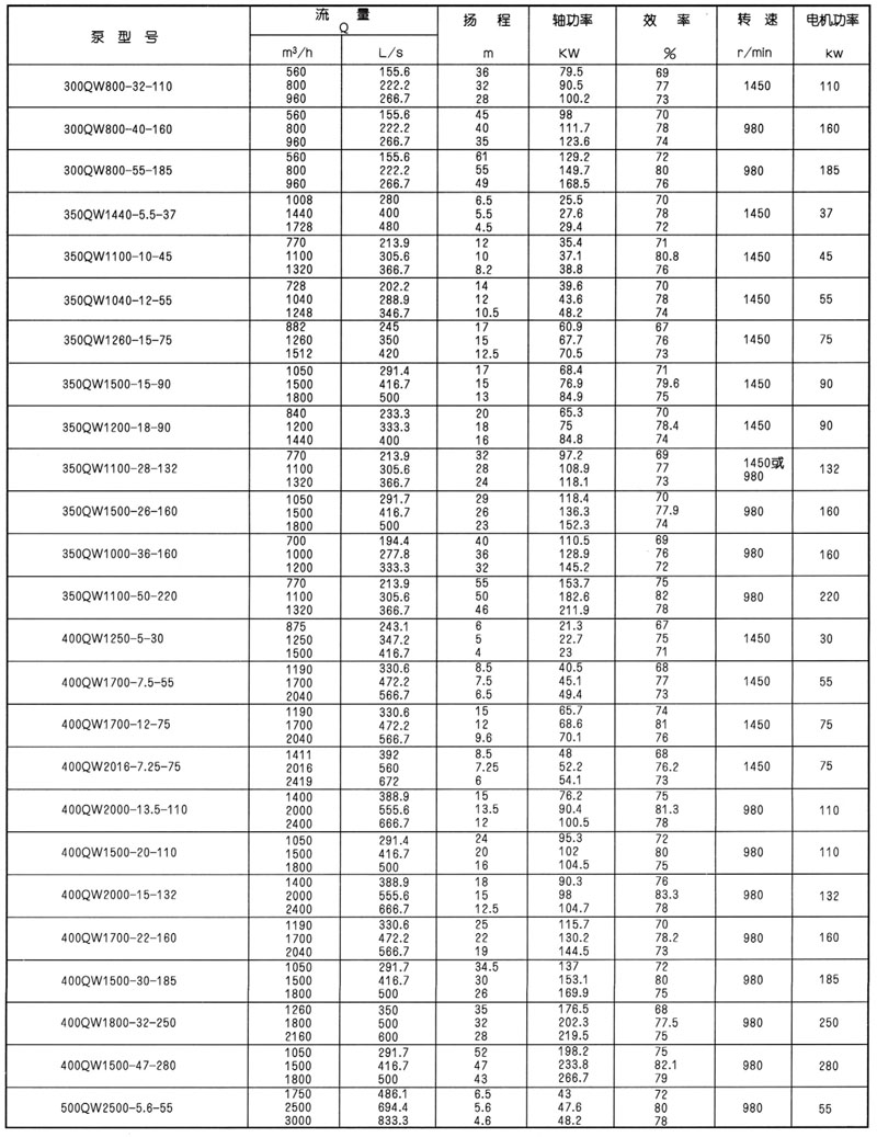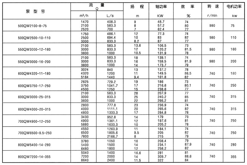 本泵流量范圍:7~8600m?/h;揚(yáng)程范圍:3~80m;額定轉(zhuǎn)速:740~2900r/min;系統(tǒng)壓力: 1.0MPa;介質(zhì)溫度-15~60℃;介質(zhì)PH值范圍:4~10;介質(zhì)密度: 1.3×10kg/m;電機(jī)防護(hù)等級(jí)IP68;電機(jī)絕緣等級(jí)F級(jí);每小時(shí)啟動(dòng)次數(shù)不多于6次,且間隔均勻;最大潛水深度20m;旋轉(zhuǎn)方向:從電機(jī)端看泵為順時(shí)針?lè)较蛐D(zhuǎn)。