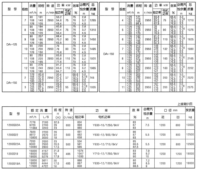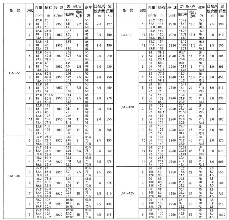 型號意義:如DA1-100X5。100-泵進(jìn)、出口直徑(mm),5-泵的級數(shù)。