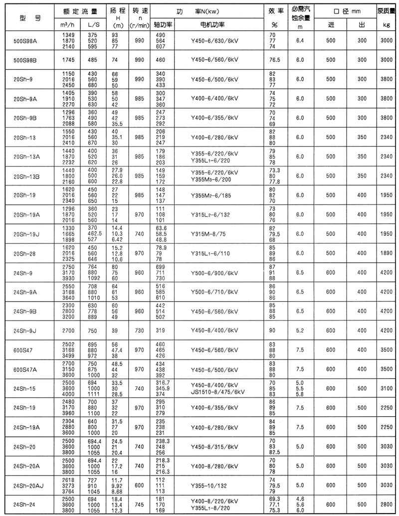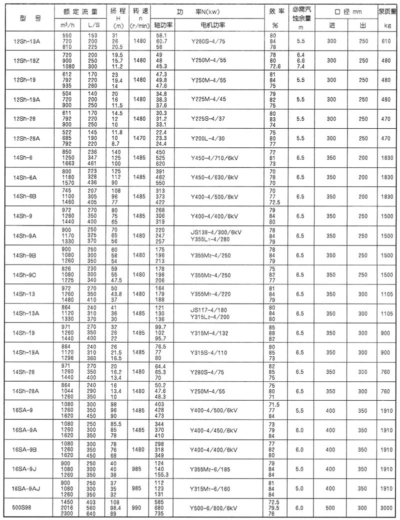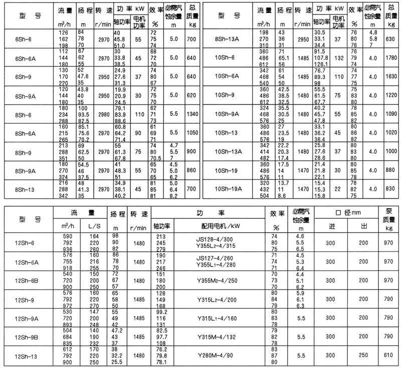 制造材料:泵體、泵蓋--鑄鐵或球墨鑄鐵,葉輪--鑄鐵、球墨鑄鐵或鑄銅,軸—-碳鋼或不銹鋼。功率 100kW的泵,都配共同底座,功率三100kW、口徑350的,只有在用戶要求時才供應(yīng)共同底座。泵型號中數(shù)字的意義:如10Sh-9A。10--泵的進(jìn)出口直徑被25除(該泵的口徑為250),19—-泵的比轉(zhuǎn)數(shù)被10除,A--泵的葉輪經(jīng)第一次切割。