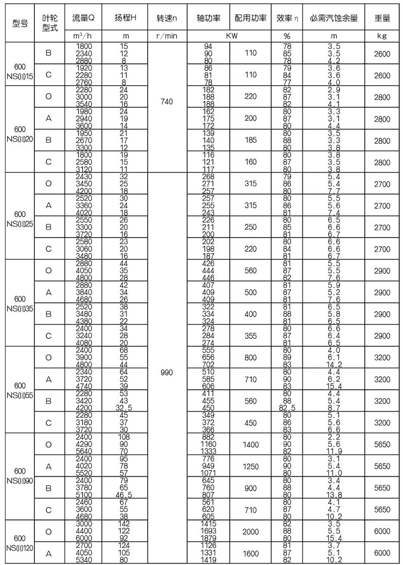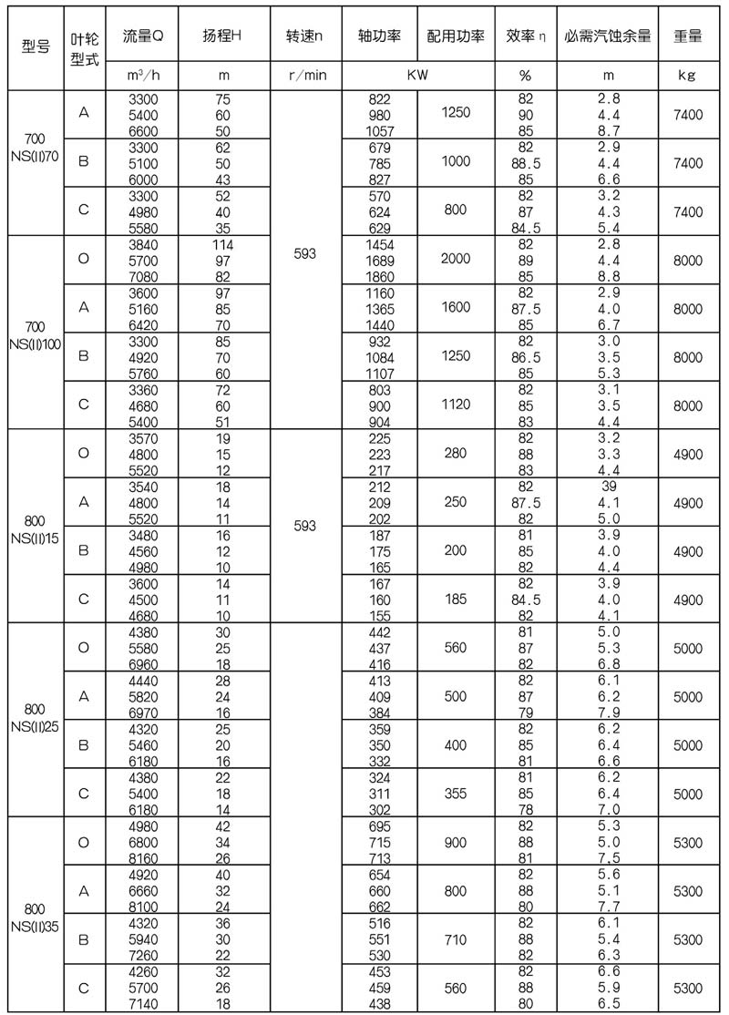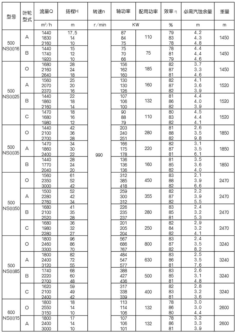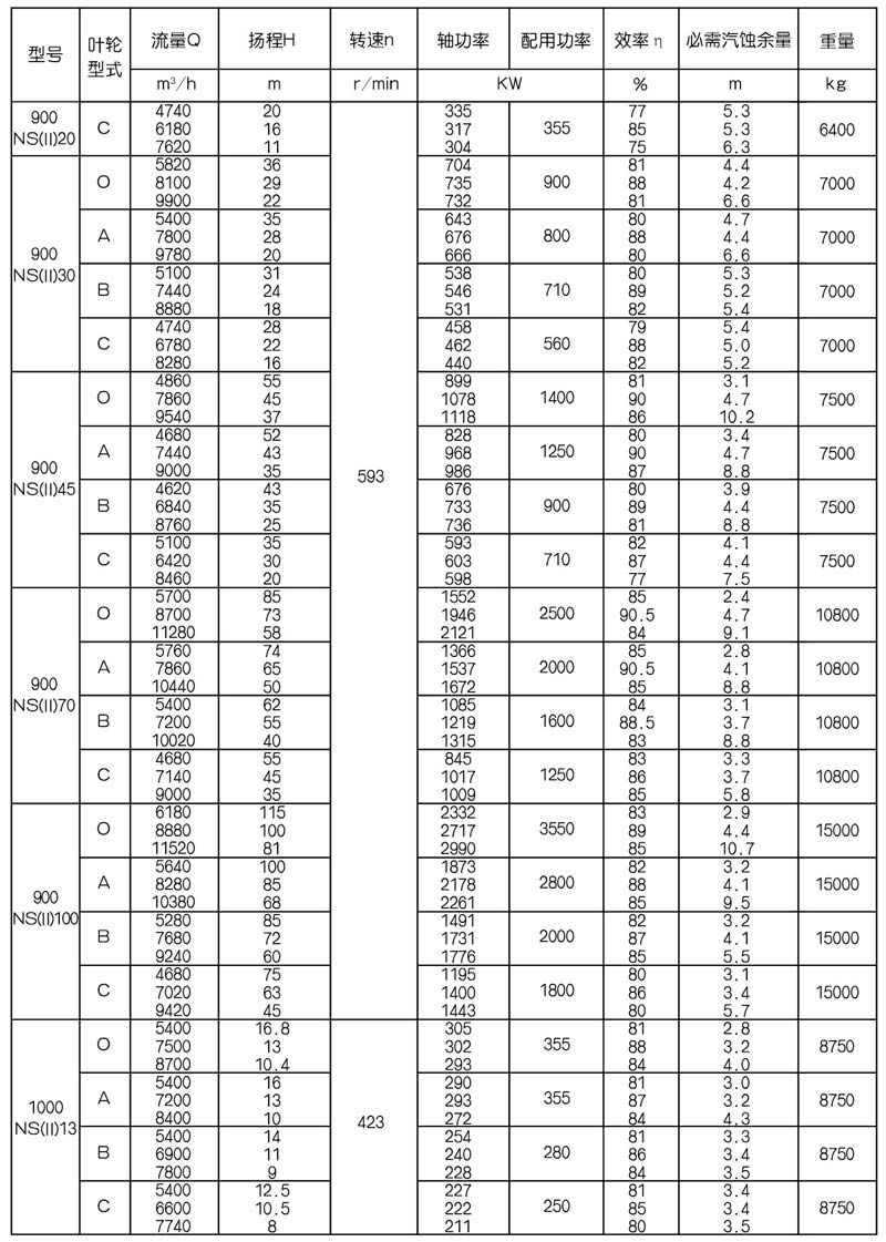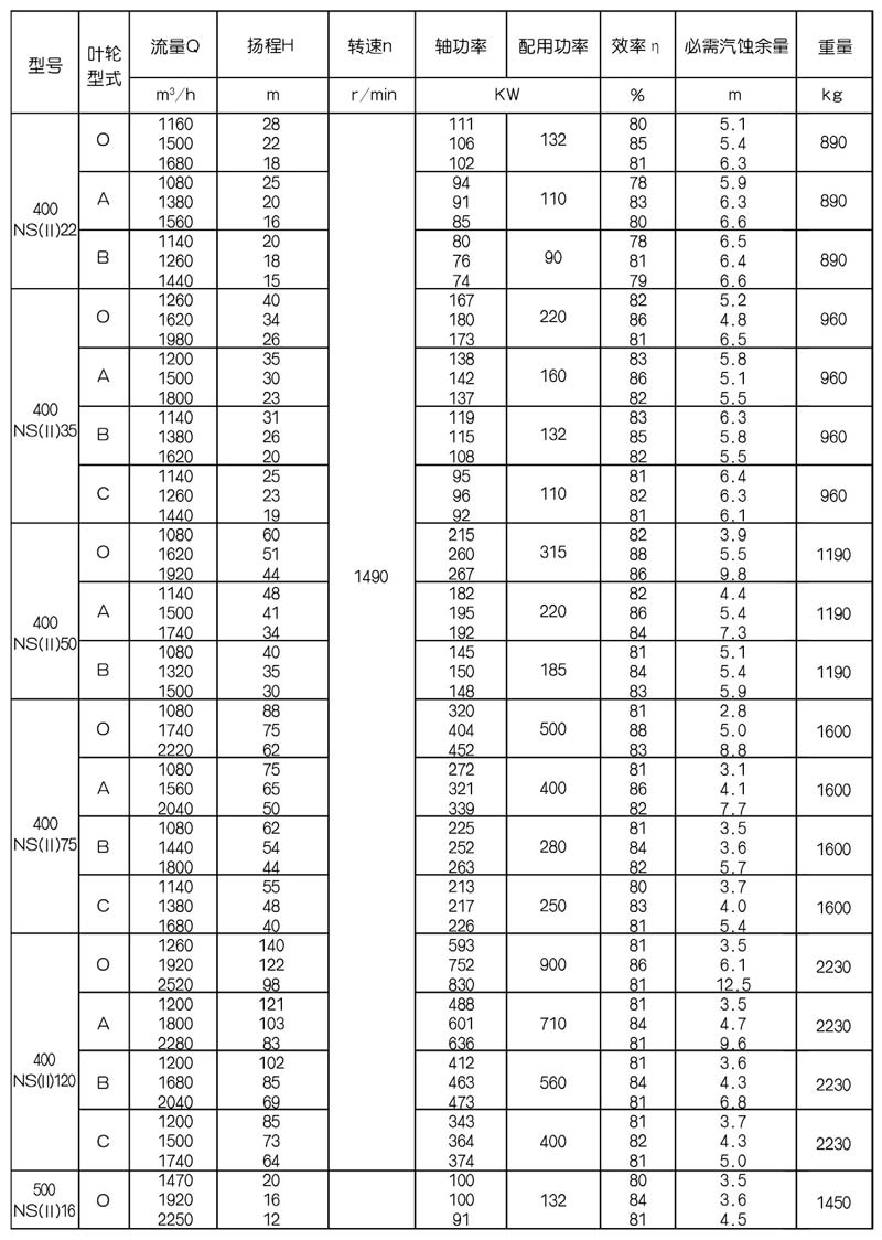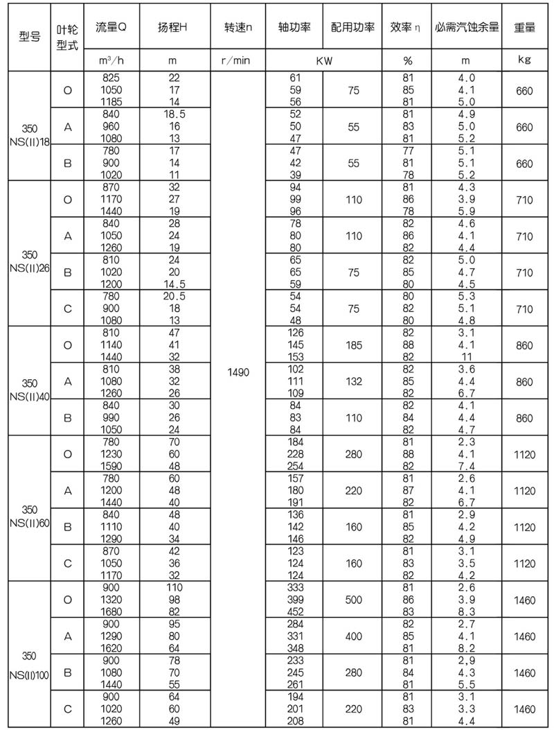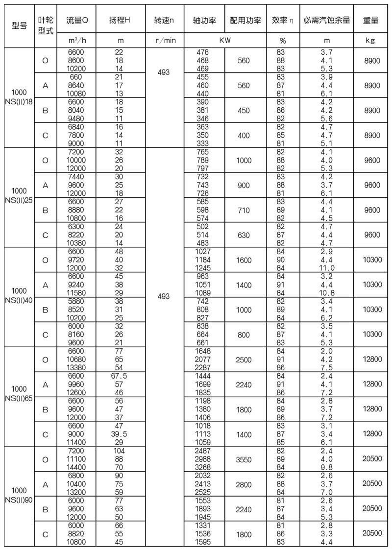 NS(Ⅱ)型泵具有很高的效率,在較寬的流量范圍內(nèi)具有很高的運(yùn)行效率,可以降低運(yùn)行費(fèi)用和選用功率較小的電機(jī),是節(jié)能的高效率中開泵。