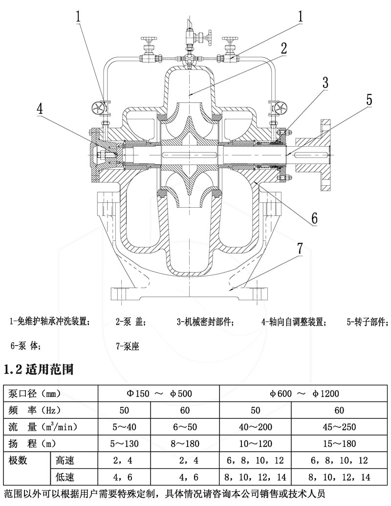 ES 型雙吸泵的軸承為位于泵體內(nèi)部的自潤(rùn)滑軸承來(lái)支撐轉(zhuǎn)子部件,其較大優(yōu)點(diǎn)是免維護(hù)(即無(wú)需日常維護(hù)保養(yǎng)),并具有安裝空間小、運(yùn)行平穩(wěn)、效率高,運(yùn)行及檢修費(fèi)用更低。
