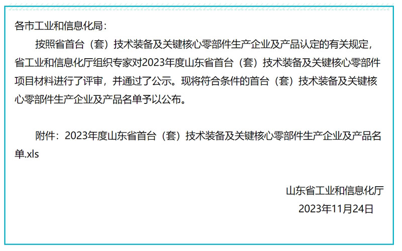按照省首臺(tái)(套)技術(shù)裝備及關(guān)鍵核心零部件生產(chǎn)企業(yè)及產(chǎn)品認(rèn)定的有關(guān)規(guī)定,經(jīng)各市工業(yè)和信息化局推薦,專家評(píng)審等環(huán)節(jié),擬將286種產(chǎn)品列入《2023年度山東省首臺(tái)(套)技術(shù)裝備及關(guān)鍵核心零部件企業(yè)及產(chǎn)品名單》